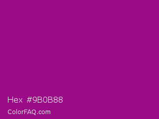 Hex #9b0b88 Color is a normal magenta color and the nearest color is Violet Eggplant #991199. Hex code #9b0b88 and RGB value is rgb(155,11,136). In RGB color space, this color is composed of 61% red, 4% green, 53% blue, In CMYK color space, this color is composed of 0% cyan, 93% magenta, 12% yellow , 39% black , In HSL color space, this color has a hue angle of 308° , 87% saturation and 33% lightness.