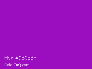 Hex #9b0ebf Color is a normal purple color and the nearest color is Purple Munsell #9f00c5. Hex code #9b0ebf and RGB value is rgb(155,14,191). In RGB color space, this color is composed of 61% red, 5% green, 75% blue, In CMYK color space, this color is composed of 19% cyan, 93% magenta, 0% yellow , 25% black , In HSL color space, this color has a hue angle of 288° , 86% saturation and 40% lightness.