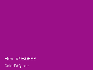 Hex #9b0f88 Color is a normal magenta color and the nearest color is Violet Eggplant #991199. Hex code #9b0f88 and RGB value is rgb(155,15,136). In RGB color space, this color is composed of 61% red, 6% green, 53% blue, In CMYK color space, this color is composed of 0% cyan, 90% magenta, 12% yellow , 39% black , In HSL color space, this color has a hue angle of 308° , 82% saturation and 33% lightness.