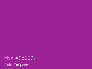 Hex #9b2297 Color is a normal magenta color and the nearest color is Violet Eggplant #991199. Hex code #9b2297 and RGB value is rgb(155,34,151). In RGB color space, this color is composed of 61% red, 13% green, 59% blue, In CMYK color space, this color is composed of 0% cyan, 78% magenta, 3% yellow , 39% black , In HSL color space, this color has a hue angle of 302° , 64% saturation and 37% lightness.