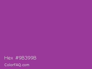 Hex #9b399b Color is a normal magenta color and the nearest color is Plum #8e4585. Hex code #9b399b and RGB value is rgb(155,57,155). In RGB color space, this color is composed of 61% red, 22% green, 61% blue, In CMYK color space, this color is composed of 0% cyan, 63% magenta, 0% yellow , 39% black , In HSL color space, this color has a hue angle of 300° , 46% saturation and 42% lightness.