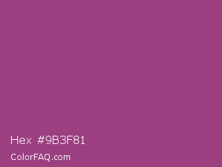 Hex #9b3f81 Color is a normal magenta color and the nearest color is Magenta Haze #9f4576. Hex code #9b3f81 and RGB value is rgb(155,63,129). In RGB color space, this color is composed of 61% red, 25% green, 51% blue, In CMYK color space, this color is composed of 0% cyan, 59% magenta, 17% yellow , 39% black , In HSL color space, this color has a hue angle of 317° , 42% saturation and 43% lightness.