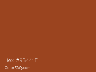 Hex #9b441f Color is a normal orange color and the nearest color is Cumin #924321. Hex code #9b441f and RGB value is rgb(155,68,31). In RGB color space, this color is composed of 61% red, 27% green, 12% blue, In CMYK color space, this color is composed of 0% cyan, 56% magenta, 80% yellow , 39% black , In HSL color space, this color has a hue angle of 18° , 67% saturation and 36% lightness.