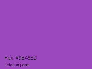 Hex #9b48bd Color is a normal purple color and the nearest color is Purple Plum #9c51b6. Hex code #9b48bd and RGB value is rgb(155,72,189). In RGB color space, this color is composed of 61% red, 28% green, 74% blue, In CMYK color space, this color is composed of 18% cyan, 62% magenta, 0% yellow , 26% black , In HSL color space, this color has a hue angle of 283° , 47% saturation and 51% lightness.