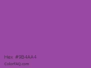 Hex #9b4aa4 Color is a normal magenta color and the nearest color is Purpureus #9a4eae. Hex code #9b4aa4 and RGB value is rgb(155,74,164). In RGB color space, this color is composed of 61% red, 29% green, 64% blue, In CMYK color space, this color is composed of 5% cyan, 55% magenta, 0% yellow , 36% black , In HSL color space, this color has a hue angle of 294° , 38% saturation and 47% lightness.