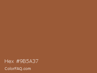 Hex #9b5a37 Color is a normal orange color and the nearest color is Coconut #965a3e. Hex code #9b5a37 and RGB value is rgb(155,90,55). In RGB color space, this color is composed of 61% red, 35% green, 22% blue, In CMYK color space, this color is composed of 0% cyan, 42% magenta, 65% yellow , 39% black , In HSL color space, this color has a hue angle of 21° , 48% saturation and 41% lightness.