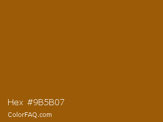 Hex #9b5b07 Color is a normal orange color and the nearest color is Chelsea Gem #9e5302. Hex code #9b5b07 and RGB value is rgb(155,91,7). In RGB color space, this color is composed of 61% red, 36% green, 3% blue, In CMYK color space, this color is composed of 0% cyan, 41% magenta, 95% yellow , 39% black , In HSL color space, this color has a hue angle of 34° , 91% saturation and 32% lightness.