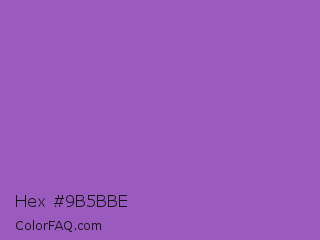 Hex #9b5bbe Color is a normal purple color and the nearest color is Deep Lilac #9955bb. Hex code #9b5bbe and RGB value is rgb(155,91,190). In RGB color space, this color is composed of 61% red, 36% green, 75% blue, In CMYK color space, this color is composed of 18% cyan, 52% magenta, 0% yellow , 25% black , In HSL color space, this color has a hue angle of 279° , 43% saturation and 55% lightness.