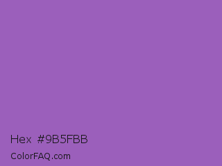 Hex #9b5fbb Color is a normal purple color and the nearest color is Deep Lilac #9955bb. Hex code #9b5fbb and RGB value is rgb(155,95,187). In RGB color space, this color is composed of 61% red, 37% green, 73% blue, In CMYK color space, this color is composed of 17% cyan, 49% magenta, 0% yellow , 27% black , In HSL color space, this color has a hue angle of 279° , 40% saturation and 55% lightness.