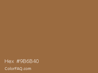 Hex #9b6b40 Color is a normal orange color and the nearest color is Cape Palliser #a26645. Hex code #9b6b40 and RGB value is rgb(155,107,64). In RGB color space, this color is composed of 61% red, 42% green, 25% blue, In CMYK color space, this color is composed of 0% cyan, 31% magenta, 59% yellow , 39% black , In HSL color space, this color has a hue angle of 28° , 42% saturation and 43% lightness.