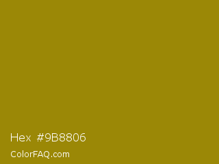 Hex #9b8806 Color is a normal yellow color and the nearest color is Dark Yellow #9b870c. Hex code #9b8806 and RGB value is rgb(155,136,6). In RGB color space, this color is composed of 61% red, 53% green, 2% blue, In CMYK color space, this color is composed of 0% cyan, 12% magenta, 96% yellow , 39% black , In HSL color space, this color has a hue angle of 52° , 93% saturation and 32% lightness.
