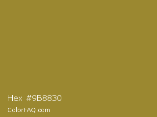 Hex #9b8830 Color is a normal yellow color and the nearest color is Luxor Gold #a7882c. Hex code #9b8830 and RGB value is rgb(155,136,48). In RGB color space, this color is composed of 61% red, 53% green, 19% blue, In CMYK color space, this color is composed of 0% cyan, 12% magenta, 69% yellow , 39% black , In HSL color space, this color has a hue angle of 49° , 53% saturation and 40% lightness.