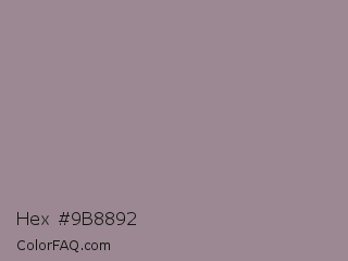 Hex #9b8892 Color is a normal rose color and the nearest color is Venus #928590. Hex code #9b8892 and RGB value is rgb(155,136,146). In RGB color space, this color is composed of 61% red, 53% green, 57% blue, In CMYK color space, this color is composed of 0% cyan, 12% magenta, 6% yellow , 39% black , In HSL color space, this color has a hue angle of 328° , 9% saturation and 57% lightness.
