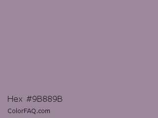 Hex #9b889b Color is a normal magenta color and the nearest color is Mountain Mist #959396. Hex code #9b889b and RGB value is rgb(155,136,155). In RGB color space, this color is composed of 61% red, 53% green, 61% blue, In CMYK color space, this color is composed of 0% cyan, 12% magenta, 0% yellow , 39% black , In HSL color space, this color has a hue angle of 300° , 9% saturation and 57% lightness.