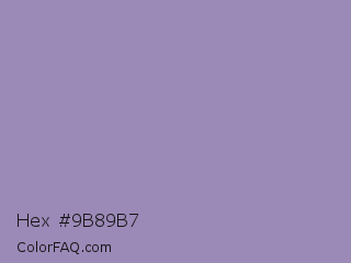 Hex #9b89b7 Color is a light violet color and the nearest color is Lavender Purple #967bb6. Hex code #9b89b7 and RGB value is rgb(155,137,183). In RGB color space, this color is composed of 61% red, 54% green, 72% blue, In CMYK color space, this color is composed of 15% cyan, 25% magenta, 0% yellow , 28% black , In HSL color space, this color has a hue angle of 263° , 24% saturation and 63% lightness.