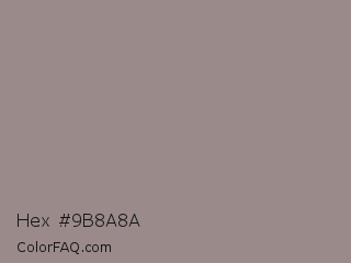 Hex #9b8a8a Color is a normal red color and the nearest color is Venus #928590. Hex code #9b8a8a and RGB value is rgb(155,138,138). In RGB color space, this color is composed of 61% red, 54% green, 54% blue, In CMYK color space, this color is composed of 0% cyan, 11% magenta, 11% yellow , 39% black , In HSL color space, this color has a hue angle of 0° , 8% saturation and 57% lightness.
