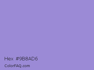 Hex #9b8ad6 Color is a light indigo color and the nearest color is Blue Bell Crayola #9999cc. Hex code #9b8ad6 and RGB value is rgb(155,138,214). In RGB color space, this color is composed of 61% red, 54% green, 84% blue, In CMYK color space, this color is composed of 28% cyan, 36% magenta, 0% yellow , 16% black , In HSL color space, this color has a hue angle of 253° , 48% saturation and 69% lightness.