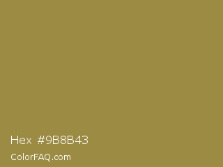 Hex #9b8b43 Color is a normal yellow color and the nearest color is Sycamore #908d39. Hex code #9b8b43 and RGB value is rgb(155,139,67). In RGB color space, this color is composed of 61% red, 55% green, 26% blue, In CMYK color space, this color is composed of 0% cyan, 10% magenta, 57% yellow , 39% black , In HSL color space, this color has a hue angle of 49° , 40% saturation and 44% lightness.