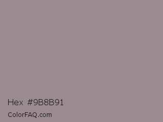 Hex #9b8b91 Color is a normal rose color and the nearest color is Venus #928590. Hex code #9b8b91 and RGB value is rgb(155,139,145). In RGB color space, this color is composed of 61% red, 55% green, 57% blue, In CMYK color space, this color is composed of 0% cyan, 10% magenta, 6% yellow , 39% black , In HSL color space, this color has a hue angle of 338° , 7% saturation and 58% lightness.