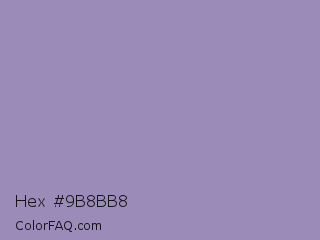Hex #9b8bb8 Color is a light violet color and the nearest color is Amethyst Smoke #a397b4. Hex code #9b8bb8 and RGB value is rgb(155,139,184). In RGB color space, this color is composed of 61% red, 55% green, 72% blue, In CMYK color space, this color is composed of 16% cyan, 24% magenta, 0% yellow , 28% black , In HSL color space, this color has a hue angle of 261° , 24% saturation and 63% lightness.