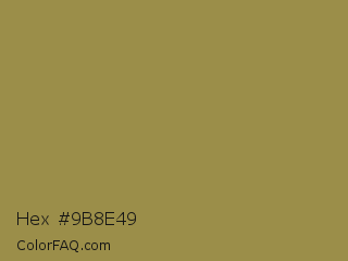 Hex #9b8e49 Color is a normal yellow color and the nearest color is Dark Tan #918151. Hex code #9b8e49 and RGB value is rgb(155,142,73). In RGB color space, this color is composed of 61% red, 56% green, 29% blue, In CMYK color space, this color is composed of 0% cyan, 8% magenta, 53% yellow , 39% black , In HSL color space, this color has a hue angle of 50° , 36% saturation and 45% lightness.