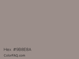 Hex #9b8e8a Color is a normal red color and the nearest color is Venus #928590. Hex code #9b8e8a and RGB value is rgb(155,142,138). In RGB color space, this color is composed of 61% red, 56% green, 54% blue, In CMYK color space, this color is composed of 0% cyan, 8% magenta, 11% yellow , 39% black , In HSL color space, this color has a hue angle of 14° , 8% saturation and 57% lightness.