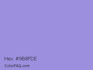 Hex #9b8fde Color is a light indigo color and the nearest color is Dull Lavender #a899e6. Hex code #9b8fde and RGB value is rgb(155,143,222). In RGB color space, this color is composed of 61% red, 56% green, 87% blue, In CMYK color space, this color is composed of 30% cyan, 36% magenta, 0% yellow , 13% black , In HSL color space, this color has a hue angle of 249° , 54% saturation and 72% lightness.
