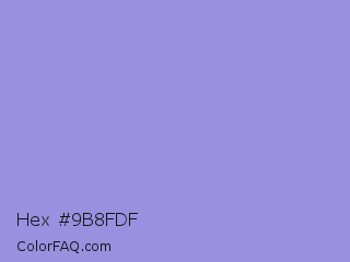 Hex #9b8fdf Color is a light indigo color and the nearest color is Dull Lavender #a899e6. Hex code #9b8fdf and RGB value is rgb(155,143,223). In RGB color space, this color is composed of 61% red, 56% green, 87% blue, In CMYK color space, this color is composed of 30% cyan, 36% magenta, 0% yellow , 13% black , In HSL color space, this color has a hue angle of 249° , 56% saturation and 72% lightness.
