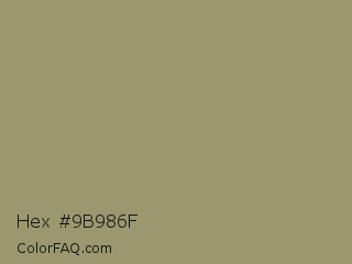 Hex #9b986f Color is a normal yellow color and the nearest color is Gurkha #9a9577. Hex code #9b986f and RGB value is rgb(155,152,111). In RGB color space, this color is composed of 61% red, 60% green, 44% blue, In CMYK color space, this color is composed of 0% cyan, 2% magenta, 28% yellow , 39% black , In HSL color space, this color has a hue angle of 56° , 18% saturation and 52% lightness.