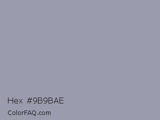 Hex #9b9bae Color is a light blue color and the nearest color is Manatee #979aaa. Hex code #9b9bae and RGB value is rgb(155,155,174). In RGB color space, this color is composed of 61% red, 61% green, 68% blue, In CMYK color space, this color is composed of 11% cyan, 11% magenta, 0% yellow , 32% black , In HSL color space, this color has a hue angle of 240° , 10% saturation and 65% lightness.