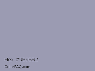 Hex #9b9bb2 Color is a light blue color and the nearest color is Santas Gray #9fa0b1. Hex code #9b9bb2 and RGB value is rgb(155,155,178). In RGB color space, this color is composed of 61% red, 61% green, 70% blue, In CMYK color space, this color is composed of 13% cyan, 13% magenta, 0% yellow , 30% black , In HSL color space, this color has a hue angle of 240° , 13% saturation and 65% lightness.