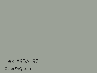 Hex #9ba197 Color is a light green color and the nearest color is Star Dust #9f9f9c. Hex code #9ba197 and RGB value is rgb(155,161,151). In RGB color space, this color is composed of 61% red, 63% green, 59% blue, In CMYK color space, this color is composed of 4% cyan, 0% magenta, 6% yellow , 37% black , In HSL color space, this color has a hue angle of 96° , 5% saturation and 61% lightness.