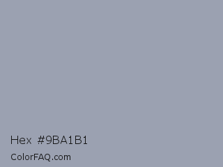 Hex #9ba1b1 Color is a light blue color and the nearest color is Santas Gray #9fa0b1. Hex code #9ba1b1 and RGB value is rgb(155,161,177). In RGB color space, this color is composed of 61% red, 63% green, 69% blue, In CMYK color space, this color is composed of 12% cyan, 9% magenta, 0% yellow , 31% black , In HSL color space, this color has a hue angle of 224° , 12% saturation and 65% lightness.