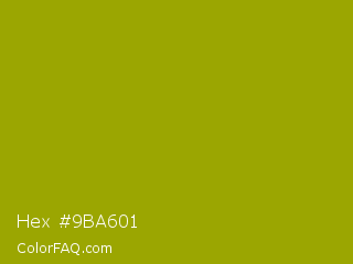 Hex #9ba601 Color is a normal yellow color and the nearest color is Apple Green #8db600. Hex code #9ba601 and RGB value is rgb(155,166,1). In RGB color space, this color is composed of 61% red, 65% green, 0% blue, In CMYK color space, this color is composed of 7% cyan, 0% magenta, 99% yellow , 35% black , In HSL color space, this color has a hue angle of 64° , 99% saturation and 33% lightness.
