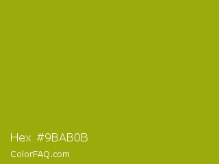Hex #9bab0b Color is a normal yellow color and the nearest color is Citron #9fa91f. Hex code #9bab0b and RGB value is rgb(155,171,11). In RGB color space, this color is composed of 61% red, 67% green, 4% blue, In CMYK color space, this color is composed of 9% cyan, 0% magenta, 94% yellow , 33% black , In HSL color space, this color has a hue angle of 66° , 88% saturation and 36% lightness.