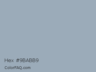 Hex #9babb9 Color is a light blue color and the nearest color is Gull Gray #9dacb7. Hex code #9babb9 and RGB value is rgb(155,171,185). In RGB color space, this color is composed of 61% red, 67% green, 73% blue, In CMYK color space, this color is composed of 16% cyan, 8% magenta, 0% yellow , 27% black , In HSL color space, this color has a hue angle of 208° , 18% saturation and 67% lightness.