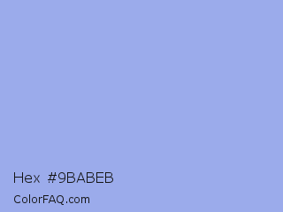 Hex #9babeb Color is a light blue color and the nearest color is Maximum Blue Purple #acace6. Hex code #9babeb and RGB value is rgb(155,171,235). In RGB color space, this color is composed of 61% red, 67% green, 92% blue, In CMYK color space, this color is composed of 34% cyan, 27% magenta, 0% yellow , 8% black , In HSL color space, this color has a hue angle of 228° , 67% saturation and 76% lightness.