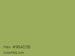 Hex #9bad5b Color is a normal lime color and the nearest color is Green Smoke #a4af6e. Hex code #9bad5b and RGB value is rgb(155,173,91). In RGB color space, this color is composed of 61% red, 68% green, 36% blue, In CMYK color space, this color is composed of 10% cyan, 0% magenta, 47% yellow , 32% black , In HSL color space, this color has a hue angle of 73° , 33% saturation and 52% lightness.