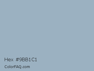 Hex #9bb1c1 Color is a light blue color and the nearest color is Gull Gray #9dacb7. Hex code #9bb1c1 and RGB value is rgb(155,177,193). In RGB color space, this color is composed of 61% red, 69% green, 76% blue, In CMYK color space, this color is composed of 20% cyan, 8% magenta, 0% yellow , 24% black , In HSL color space, this color has a hue angle of 205° , 23% saturation and 68% lightness.