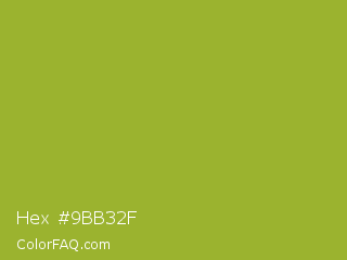 Hex #9bb32f Color is a normal lime color and the nearest color is Citron #9fa91f. Hex code #9bb32f and RGB value is rgb(155,179,47). In RGB color space, this color is composed of 61% red, 70% green, 18% blue, In CMYK color space, this color is composed of 13% cyan, 0% magenta, 74% yellow , 30% black , In HSL color space, this color has a hue angle of 71° , 58% saturation and 44% lightness.