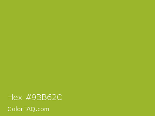 Hex #9bb62c Color is a normal lime color and the nearest color is Citron #9fa91f. Hex code #9bb62c and RGB value is rgb(155,182,44). In RGB color space, this color is composed of 61% red, 71% green, 17% blue, In CMYK color space, this color is composed of 15% cyan, 0% magenta, 76% yellow , 29% black , In HSL color space, this color has a hue angle of 72° , 61% saturation and 44% lightness.