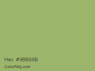 Hex #9bb66b Color is a normal green color and the nearest color is Olivine #9ab973. Hex code #9bb66b and RGB value is rgb(155,182,107). In RGB color space, this color is composed of 61% red, 71% green, 42% blue, In CMYK color space, this color is composed of 15% cyan, 0% magenta, 41% yellow , 29% black , In HSL color space, this color has a hue angle of 82° , 34% saturation and 57% lightness.