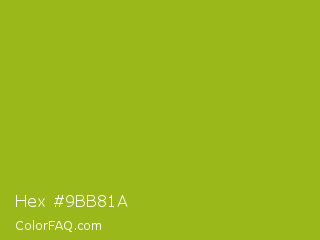 Hex #9bb81a Color is a normal lime color and the nearest color is Citron #9fa91f. Hex code #9bb81a and RGB value is rgb(155,184,26). In RGB color space, this color is composed of 61% red, 72% green, 10% blue, In CMYK color space, this color is composed of 16% cyan, 0% magenta, 86% yellow , 28% black , In HSL color space, this color has a hue angle of 71° , 75% saturation and 41% lightness.
