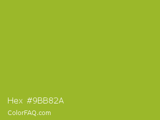 Hex #9bb82a Color is a normal lime color and the nearest color is Citron #9fa91f. Hex code #9bb82a and RGB value is rgb(155,184,42). In RGB color space, this color is composed of 61% red, 72% green, 16% blue, In CMYK color space, this color is composed of 16% cyan, 0% magenta, 77% yellow , 28% black , In HSL color space, this color has a hue angle of 72° , 63% saturation and 44% lightness.