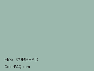Hex #9bb8ad Color is a light green color and the nearest color is Summer Green #96bbab. Hex code #9bb8ad and RGB value is rgb(155,184,173). In RGB color space, this color is composed of 61% red, 72% green, 68% blue, In CMYK color space, this color is composed of 16% cyan, 0% magenta, 6% yellow , 28% black , In HSL color space, this color has a hue angle of 157° , 17% saturation and 66% lightness.