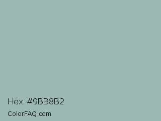 Hex #9bb8b2 Color is a light cyan color and the nearest color is Summer Green #96bbab. Hex code #9bb8b2 and RGB value is rgb(155,184,178). In RGB color space, this color is composed of 61% red, 72% green, 70% blue, In CMYK color space, this color is composed of 16% cyan, 0% magenta, 3% yellow , 28% black , In HSL color space, this color has a hue angle of 168° , 17% saturation and 66% lightness.
