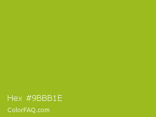 Hex #9bbb1e Color is a normal lime color and the nearest color is Citron #9fa91f. Hex code #9bbb1e and RGB value is rgb(155,187,30). In RGB color space, this color is composed of 61% red, 73% green, 12% blue, In CMYK color space, this color is composed of 17% cyan, 0% magenta, 84% yellow , 27% black , In HSL color space, this color has a hue angle of 72° , 72% saturation and 43% lightness.