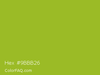 Hex #9bbb26 Color is a normal lime color and the nearest color is Atlantis #97cd2d. Hex code #9bbb26 and RGB value is rgb(155,187,38). In RGB color space, this color is composed of 61% red, 73% green, 15% blue, In CMYK color space, this color is composed of 17% cyan, 0% magenta, 80% yellow , 27% black , In HSL color space, this color has a hue angle of 73° , 66% saturation and 44% lightness.