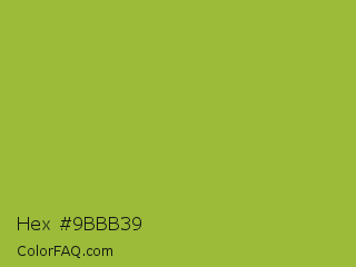 Hex #9bbb39 Color is a normal lime color and the nearest color is Android Green #a4c639. Hex code #9bbb39 and RGB value is rgb(155,187,57). In RGB color space, this color is composed of 61% red, 73% green, 22% blue, In CMYK color space, this color is composed of 17% cyan, 0% magenta, 70% yellow , 27% black , In HSL color space, this color has a hue angle of 75° , 53% saturation and 48% lightness.