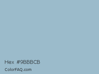 Hex #9bbbcb Color is a light blue color and the nearest color is Rock Blue #9eb1cd. Hex code #9bbbcb and RGB value is rgb(155,187,203). In RGB color space, this color is composed of 61% red, 73% green, 80% blue, In CMYK color space, this color is composed of 24% cyan, 8% magenta, 0% yellow , 20% black , In HSL color space, this color has a hue angle of 200° , 32% saturation and 70% lightness.